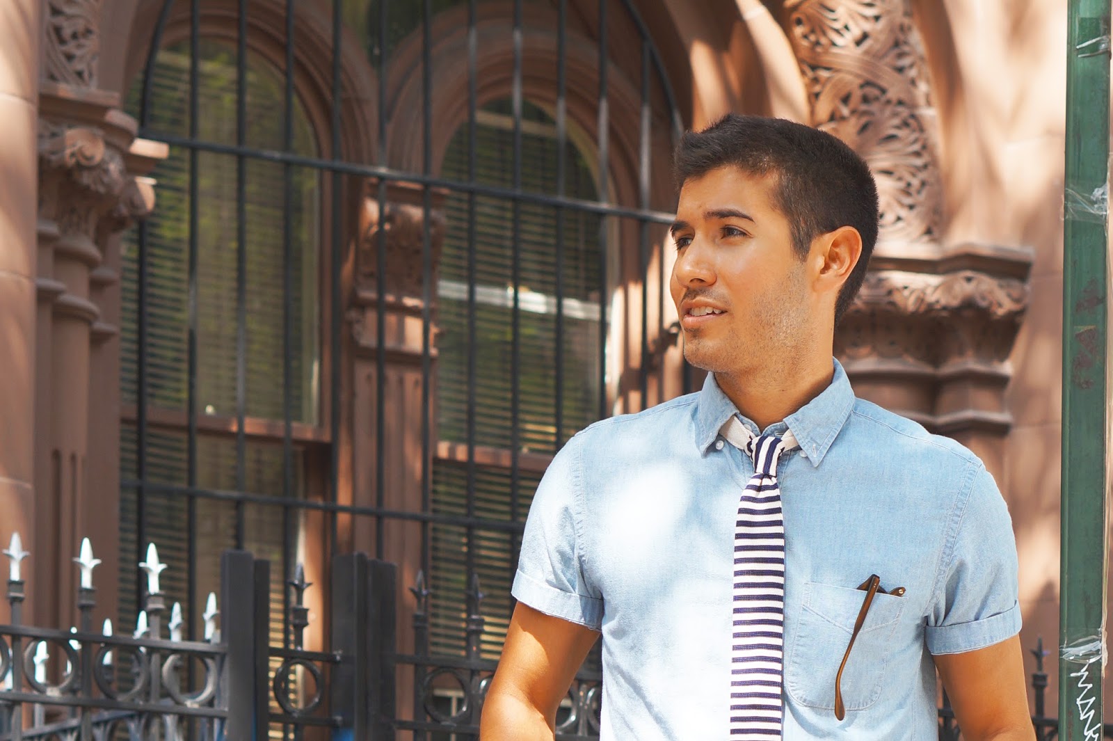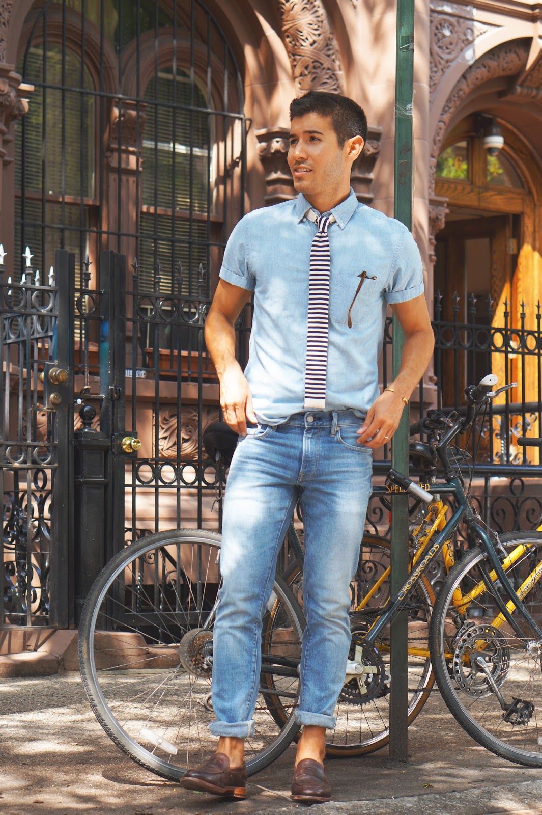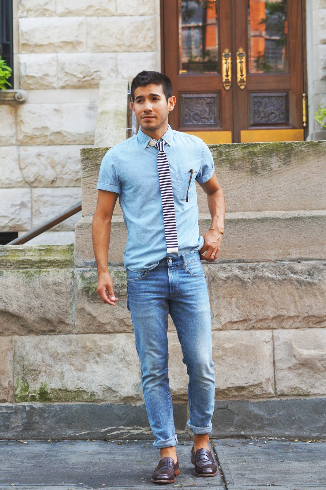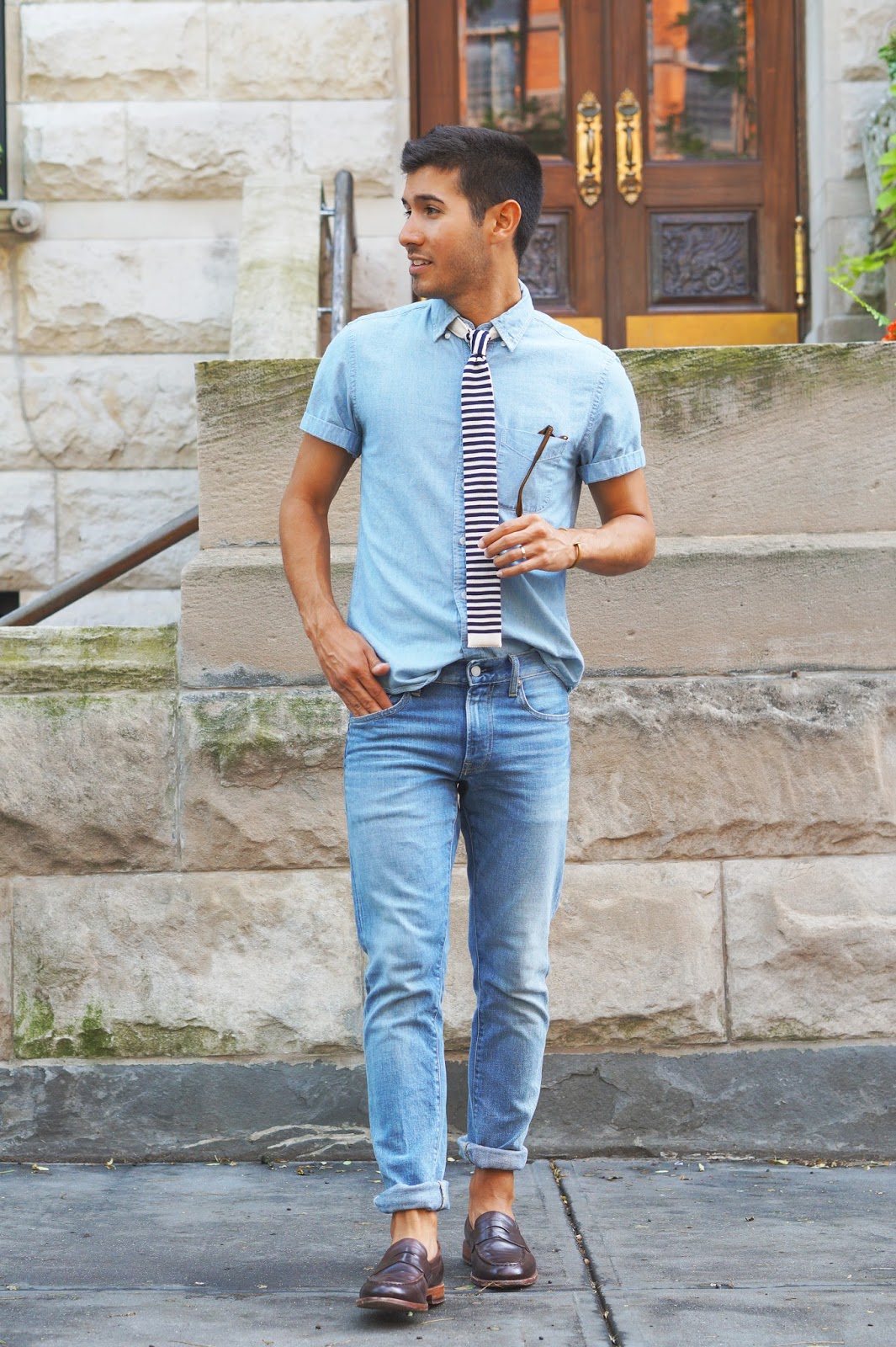 Wearing: J. Crew Chambray Short-Sleeve Shirt [similar] | Ted Baker Knit Tie | Uniqlo Selvedge Denim | J. Crew Ludlow Penny Loafers | Garrett Leight California Optical Harding Shades | Giles and Brother Skinny Railroad Cuff